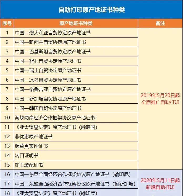在原有15种自助打印原产地证书基础上,新增以下三种原产地证书为可自助打印证书: