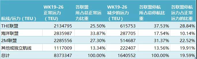 第19到26周,停航导致的运力减少比重约为19.6%。从正常运力情况来看,各船公司在亚洲-北欧航线投入的运力最多,其次是美西航线。同时北欧航线停航比重在四个航次中也是最高的,其次是地中海航线。