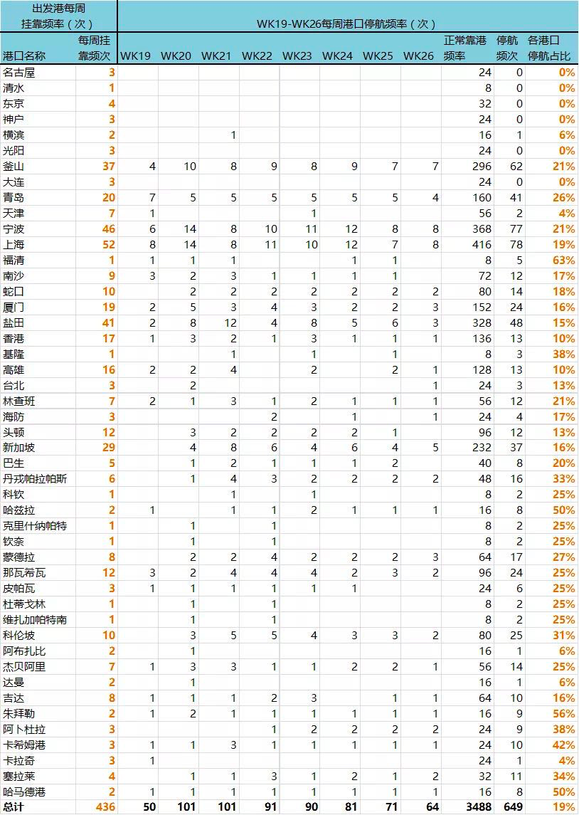 从第19-26周时间段来看,出发港口中,中国沿海十大港口受到不同程度影响。