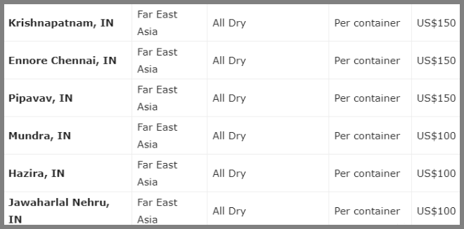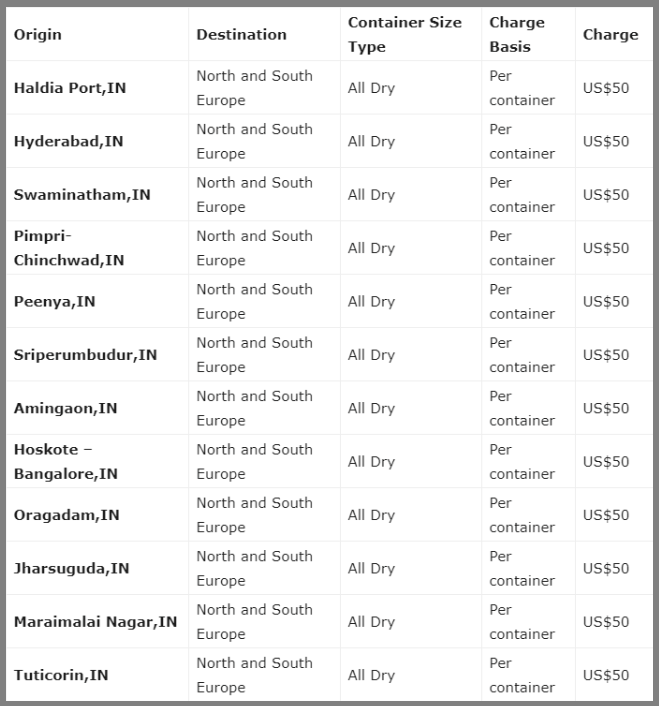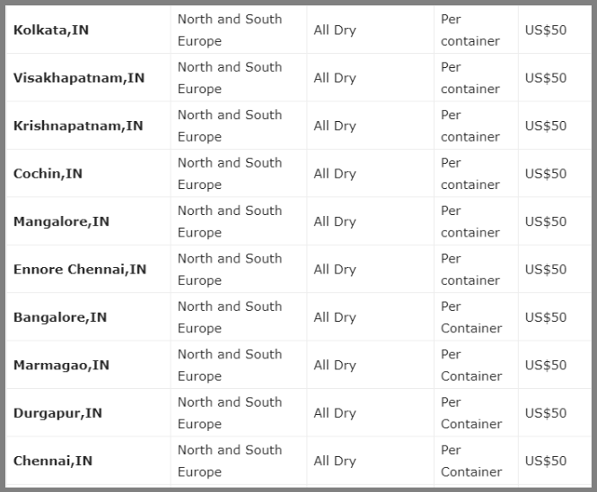 据悉马士基宣布,从2020年5月29日起,对从印度南部和东部所有港口,到欧洲北部和南部国家的所有干集装箱货物征收旺季附加费(PSS),具体如此: