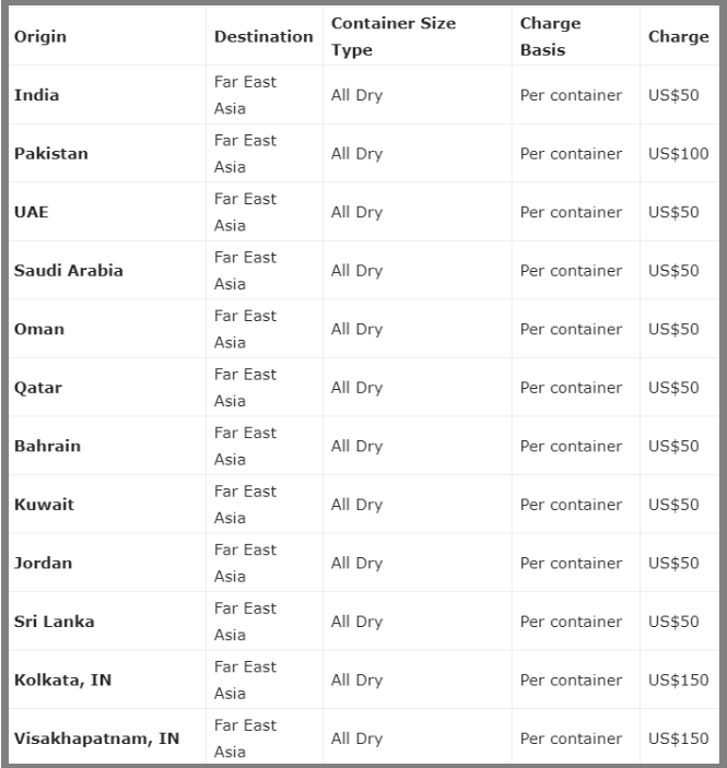 此外,从2020年5月10日至2020年5月31日,对从西亚和中亚地区到远东地区的所有干集装箱货物征收旺季附加费(PSS),具体如下: