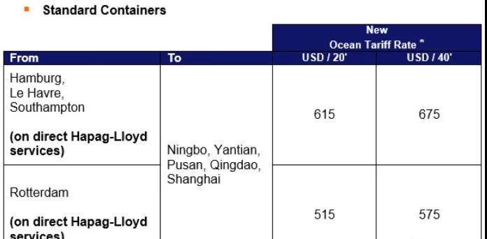 这家德国航运公司还宣布,从东亚到北欧和地中海的西行贸易中所有20'和40'(包括高立方体集装箱)货物实行新的海运费用,从2020年5月15日起开始生效,直至另行通知。