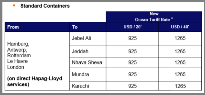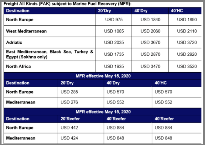同时,赫伯罗特还宣布,从2020年5月11日开始,将对从蒙德拉到阿拉伯湾和吉达的所有货物普遍涨价,具体如下: