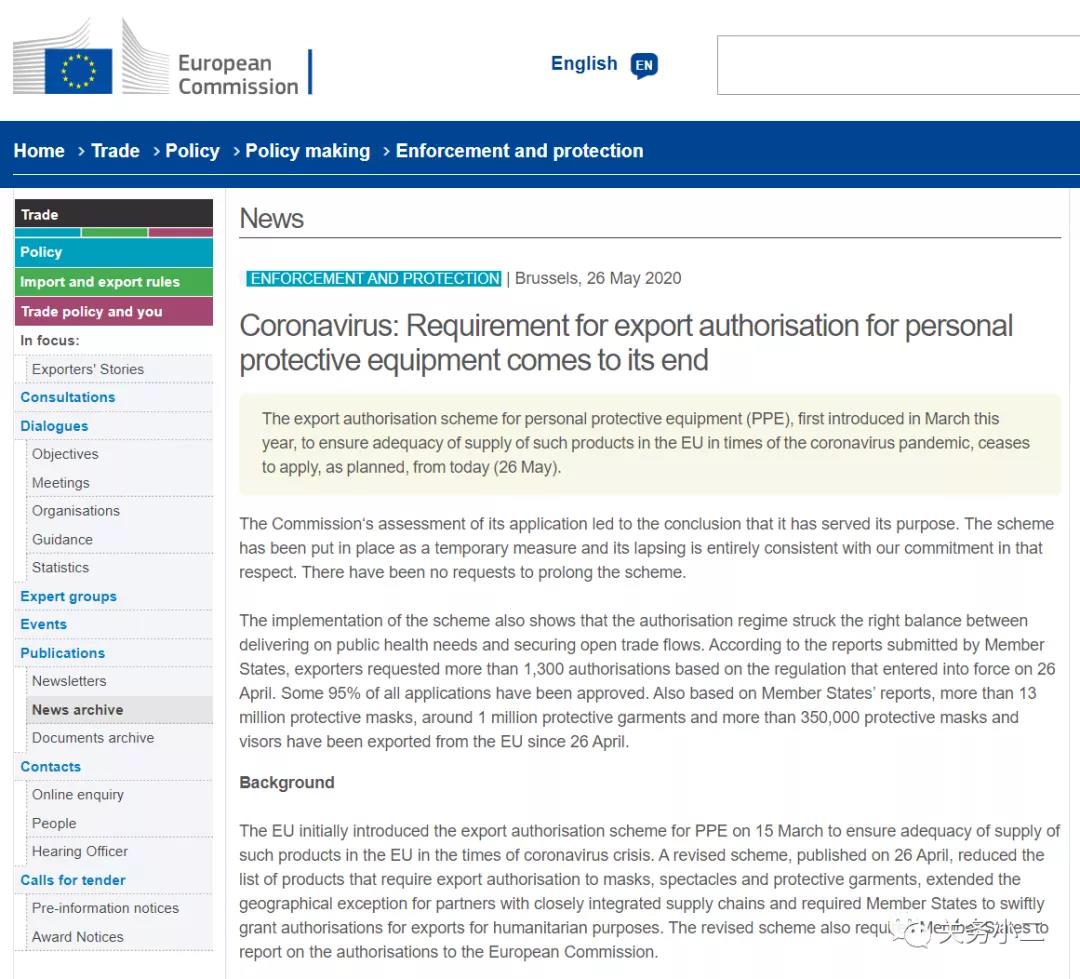 今年3月份,受疫情影响,欧盟为确保有充足的口罩等个人防护用品(PPE)供应,发布了相关出口禁令,2020年5月26日,欧盟正式取消对个人防护用品出口禁令。