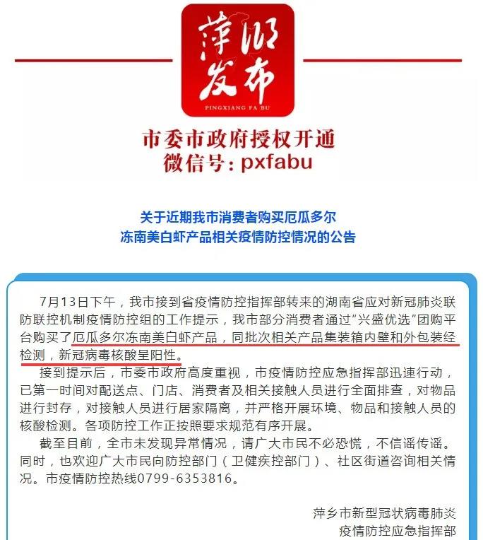 萍乡市部分消费者通过“兴盛优选”团购平台购买了厄瓜多尔冻南美白虾产品,同批次相关产品集装箱内壁和外包装经检测,新冠病毒核酸呈阳性。