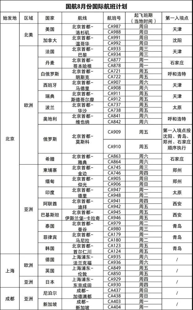 国航——8月将执飞24条国际航线,北京19条,上海3条,成都2条