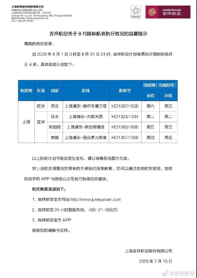自2020年8月1日0时至8月31日24时,吉祥航空计划每周执行国际航线共计4条。具体航班计划如下: