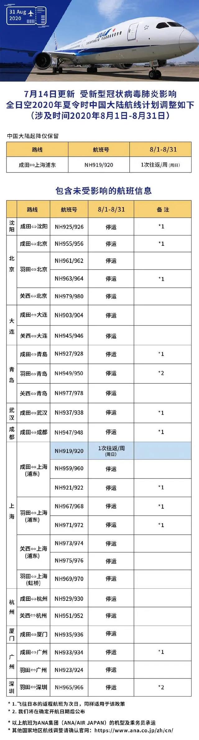 全日空航空7月14日公布8月航班计划,全日空航空8月中国大陆起降仅保留上海=成田航线(NH920/NH919)每周日运航一班。