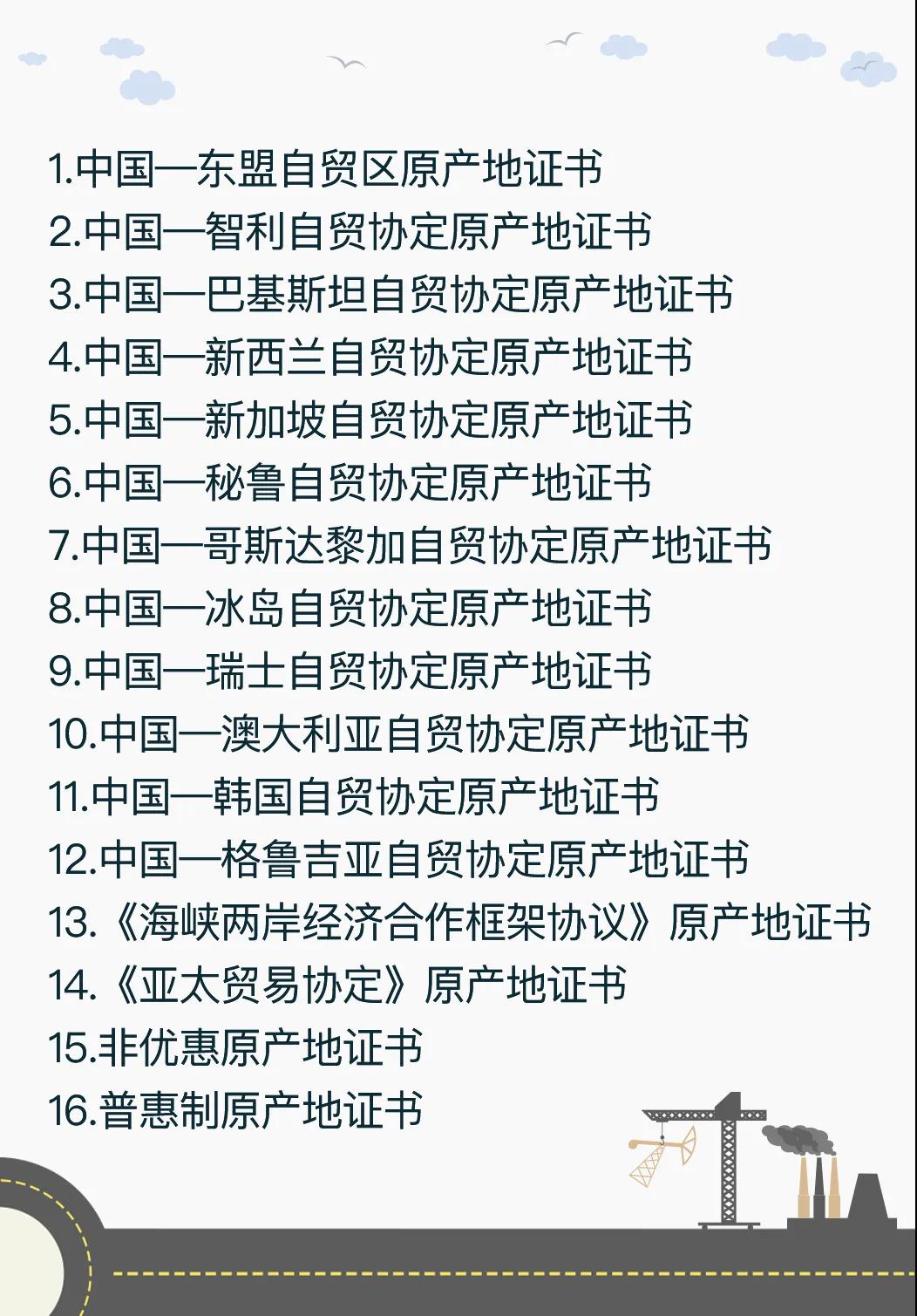 中国—东盟、中国—智利、中国—巴基斯坦、中国—新西兰、中国—新加坡、中国—秘鲁、中国—哥斯达黎加、中国—冰岛、中国—瑞士、中国—澳大利亚、中国—韩国、中国—格鲁吉亚等自贸协定原产地证书和《海峡两岸经济合作框架协议》原产地证书、《亚太贸易协定》原产地证书以及非优惠原产地证书、普惠制原产地证书。