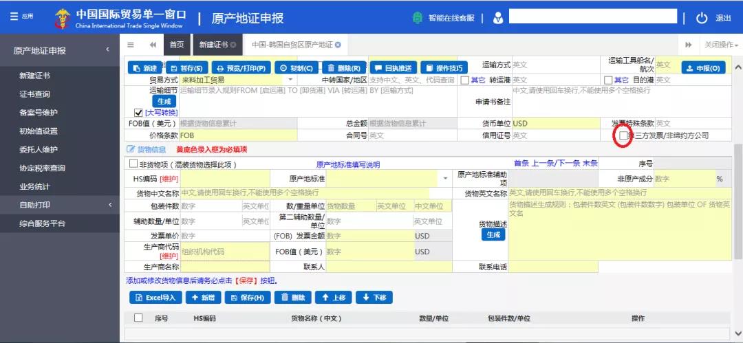 2、进口成分比例,货物生产商名称、组织机构代码、联系人、联系电话设为必填项;此外,ECFA证书英文名称设为非必填项,出口商、进口商、生产商名称地址、电话、传真、邮箱均设为必填项,电话、传真、邮箱如无的,提示企业填写“无”;