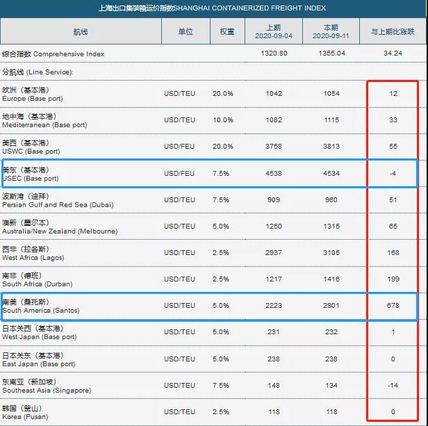 SCFI指数:上周运输需求继续向好,供求关系略显紧张,上海港船舶平均装载率保持在95%以上,部分航班满载出航。受供求良好支撑,市场运价继续在高位徘徊。9月11日,上海出口至美西、美东基本港市场运价(海运及海运附加费)分别为3813美元/FEU、4534美元/FEU,较上期分别上涨1.5%、下跌0.1%。