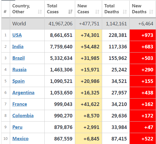 上周以为欧洲的疫情发展速度要超越美国了,但没想到,美国看起来并不想放弃这项“世界第一”——甚至单日新增破7万,一下子回到了7月以来的最高峰。