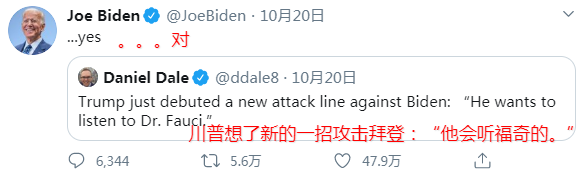 就在这种情况下,忙于大选的特朗普还发了一个推特说:如果美国民众选择拜登,后果是“他会听科学家的”。拜登对此的回复是:“...yes.”
