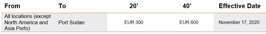 Hapag-Lloyd公告,自提单日ETD 11月17日开始,针对所有出口至Port Sudan(北美和亚洲除外)的货柜征收300欧元/TEU的拥堵费。