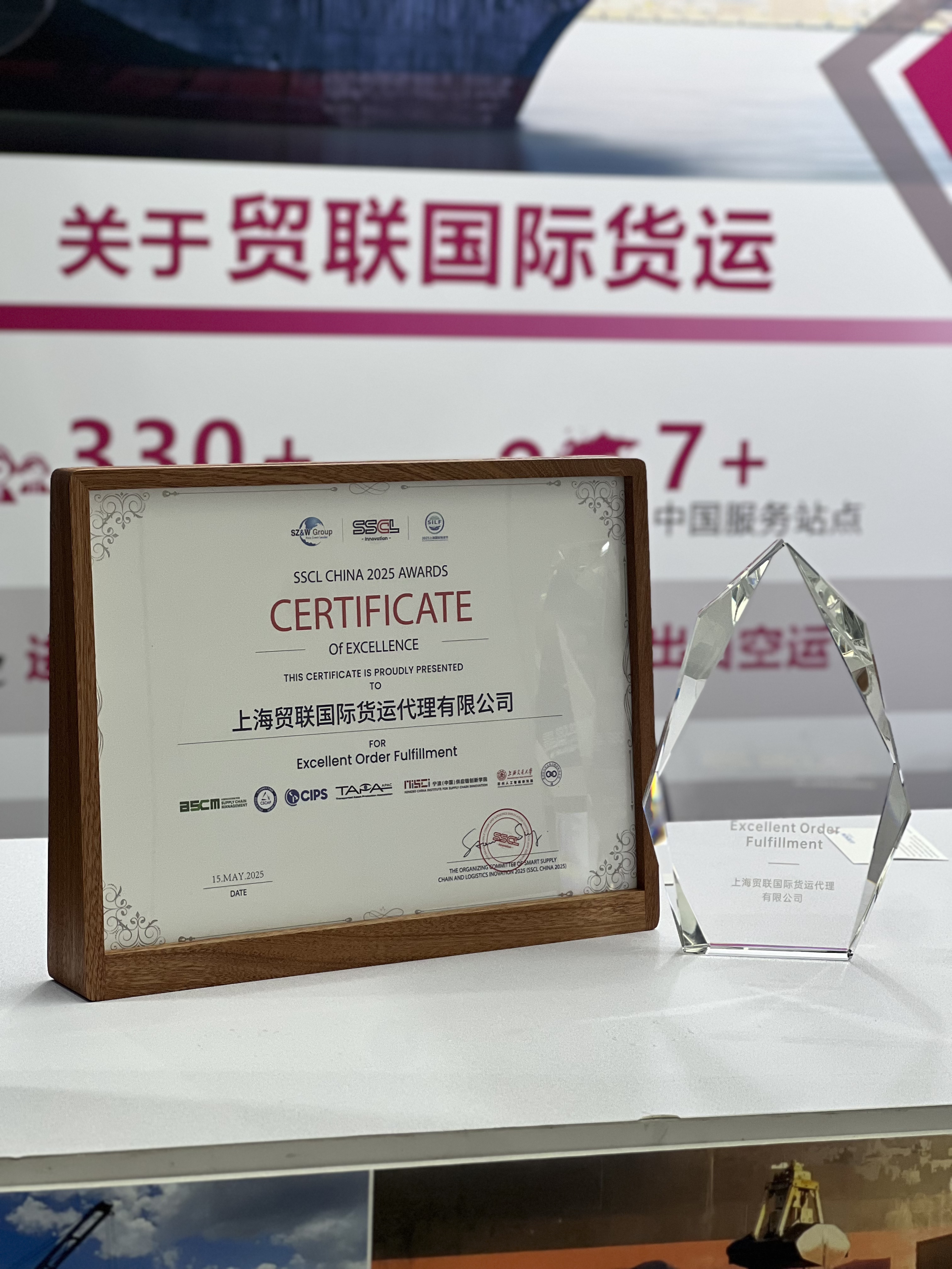 5月15、16日,上海贸联在 SSCL CHINA 2025 展会中凭借卓越的业务表现和优质的服务质量,荣获了“最佳/优秀供应链协同高效奖”以及“优秀订单履行奖”两项殊荣,这是行业及主办方对公司在国际货运代理领域专业实力的高度认可,也是上海贸联全体员工共同努力的成果。